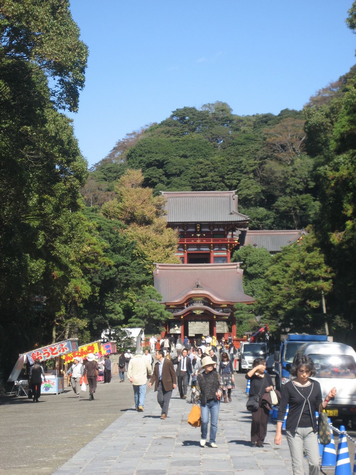 這一次到東京停留的這一段時間天氣不是太穩定,大部分的時間都是陰雨天。今天好不容易天氣放晴,不想待在東京混,捉住機會,下去鎌倉走一走。鎌倉附近的古廟多,是散步的好地方。一般來鎌倉如果時間夠多的話,喜歡從北鎌倉下火車,然後一路走到鎌倉去,邊逛邊玩。如果時間非常充裕的話,再坐上江ノ電的小火車往江ノ島的海邊去。天氣好的時候,坐在古早的火車上看看海,非常舒服。這是來東京常會作的鎌倉一日遊。非假日的時候,混在火車上載著寛邊布帽,帶著登山手杖,一副就是要到鎌倉健行的老公公老婆婆之中,也是很好玩的。 不過今天的時間實在不多,只是想捉住好天氣的尾巴,到鎌倉散散步。所以跳過了北鎌倉的円覚寺和建長寺,直接在鎌倉站下車。在若宫大路上找了個地方吃完了午餐之後,今天的重點是要到以前没去過的報国寺,想看看他們竹の庭中的那片竹林。但是在到報国寺之前,還是先要作一件每次來鎌倉都要作的事。那就是要先到鶴岡八幡宮去走走,看看那棵老銀杏。