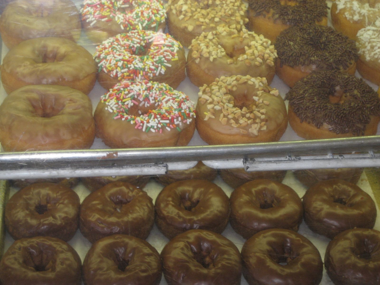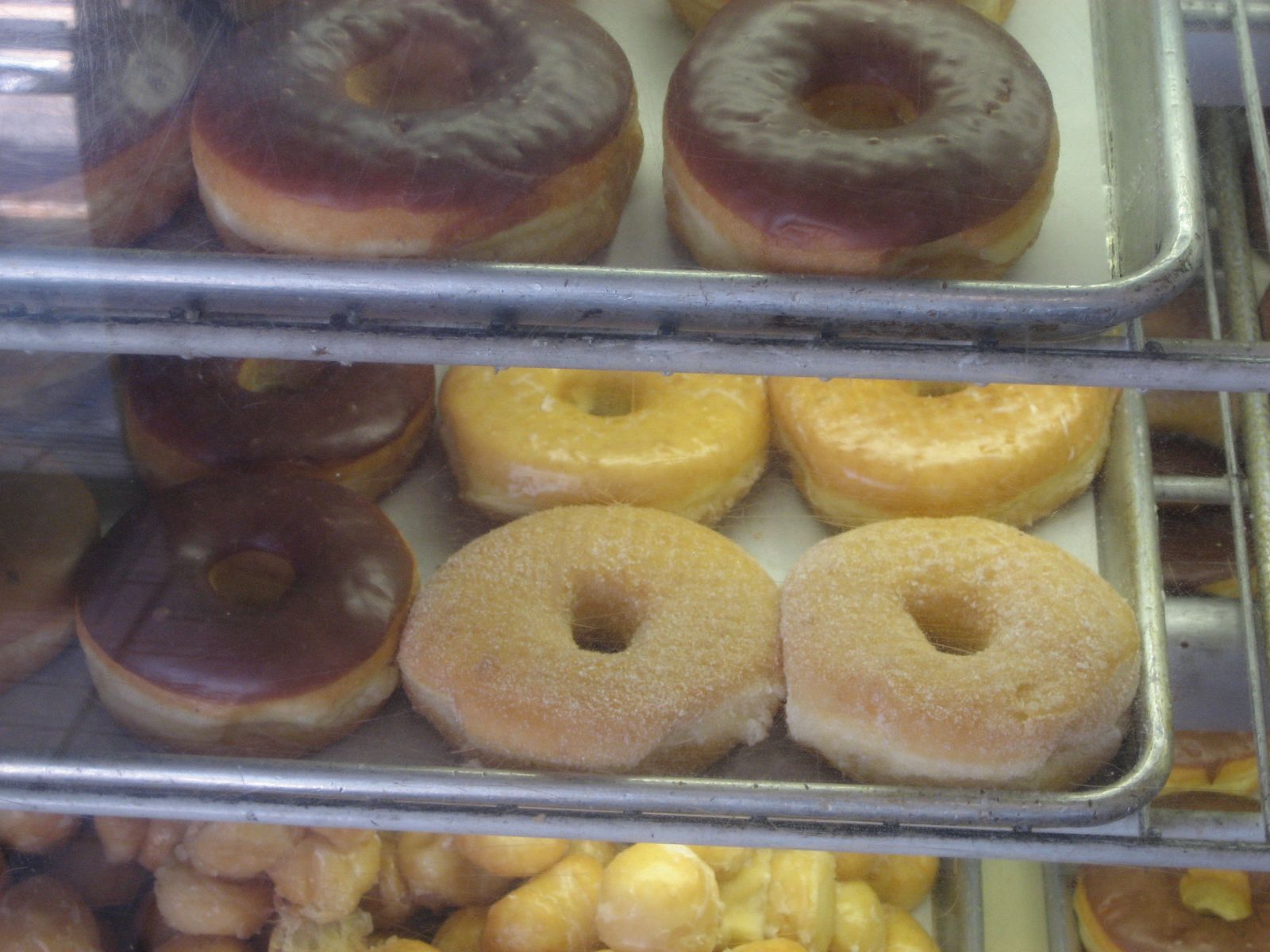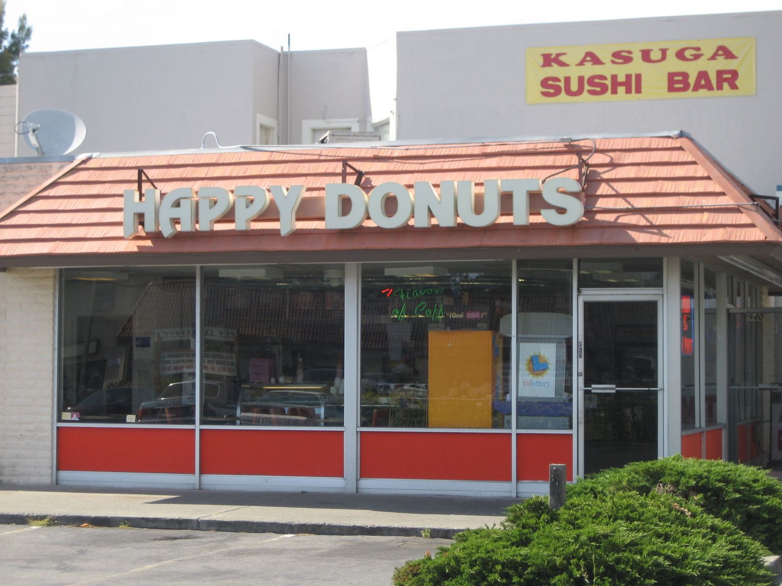 我一向對Krispy Kreme的軟式甜甜圈没什麼太大的興趣,傳統式的硬式甜甜圈比較得我心。Dunkin Donuts目前在美國東岸比較常見。中西部過了芝加哥以後,要找到它們的蹤影不容易。不過反正它們不賣自有別人賣。北加洲灣區有這一家小的連鎖加盟店Happy Donuts。以前常去南灣Palo Alto在El Camino Real上的那一家。這一次回來,發覺它們在柏克萊和舊金山也到處都看的到。很久没吃到像樣的甜甜圈,所以這次大開殺戒。這家店大部分都是廿四小時經營,所以半夜想吃甜甜圈也没問題。他們還有一個特點,就是大部分的店都是亞洲人開的。吃甜甜圈順便照顧一下自己同胞的生意,一舉兩得。