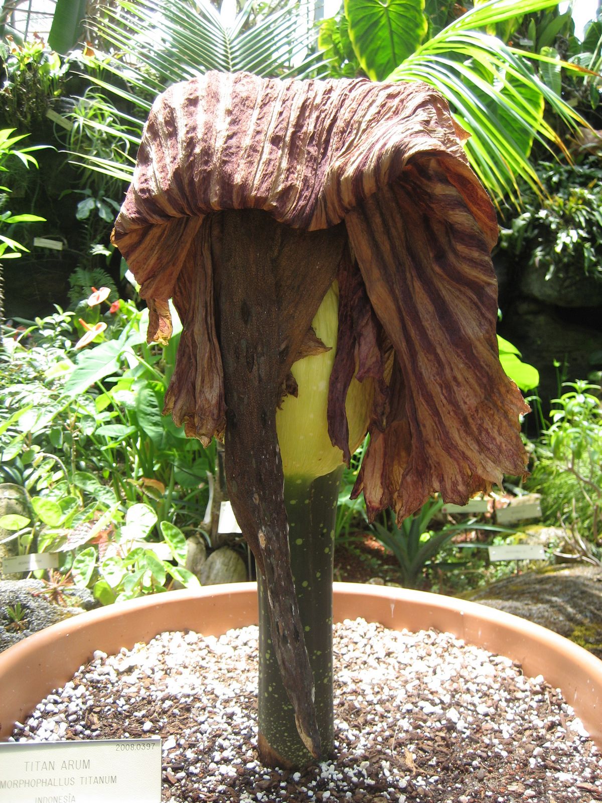 這就是上個禮拜大出風頭的,從印尼來的Titan Arum,俗稱屍體花。開花的時候臭不可當。可惜晚了一個禮拜來,已經謝了。現場没什麼味道。