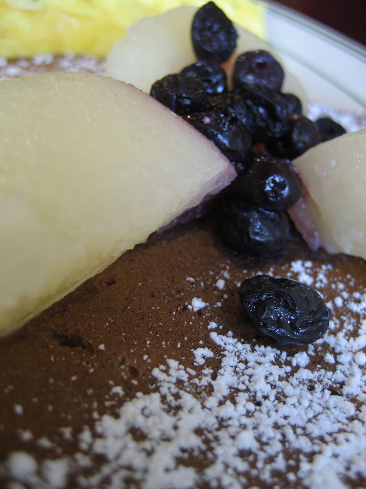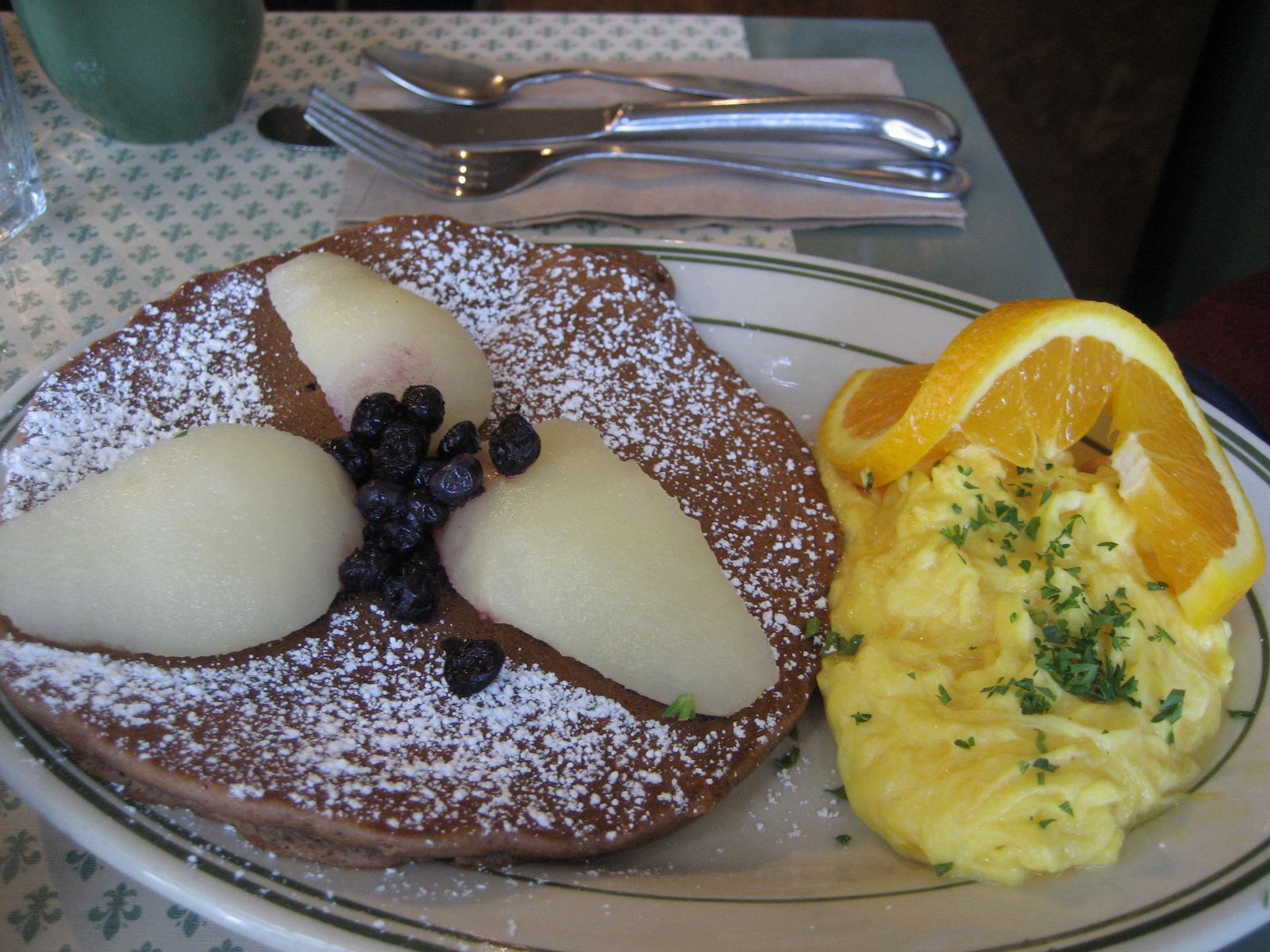 Cote Est。炒蛋加一個煎餅。煎餅是檸檬薑餅口味的。上面再加上糖水煮梨和藍苺。煎餅是它們的強項,可以選的種類很多。很多人都推薦它們的煎餅。