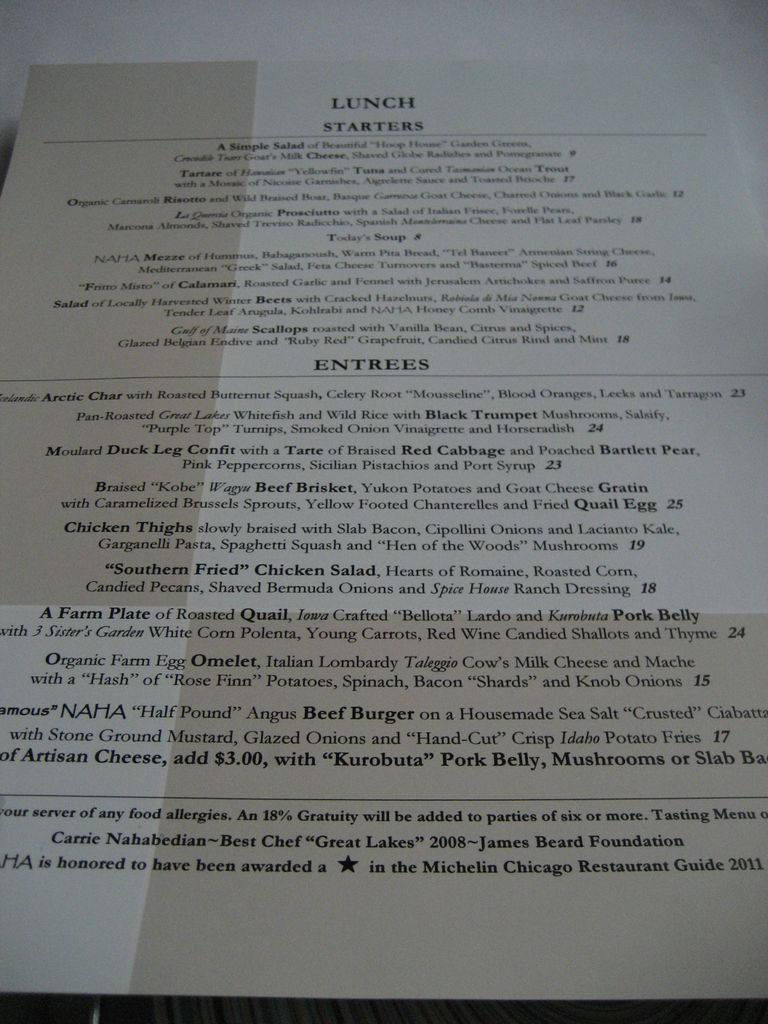 她在十年前左右回到芝加哥來開了這家Naha。她本身是中東人,又有很長一段時間待在加州,所以風格上以法國料理為底,混著中東和加州風。餐廳在芝加哥附近蠻受歡迎的。她在2008年摘下James Beard Awards五大湖區的最佳主廚頭銜,餐廳聲勢更是扶搖直上。今年的芝加哥米其林指南再幫她錦上添花,讓她這家Naha又順手摘下了米其林一星的榮譽。打滾了這麼多年的老將,最後總於還是讓她等到了這顆星星。