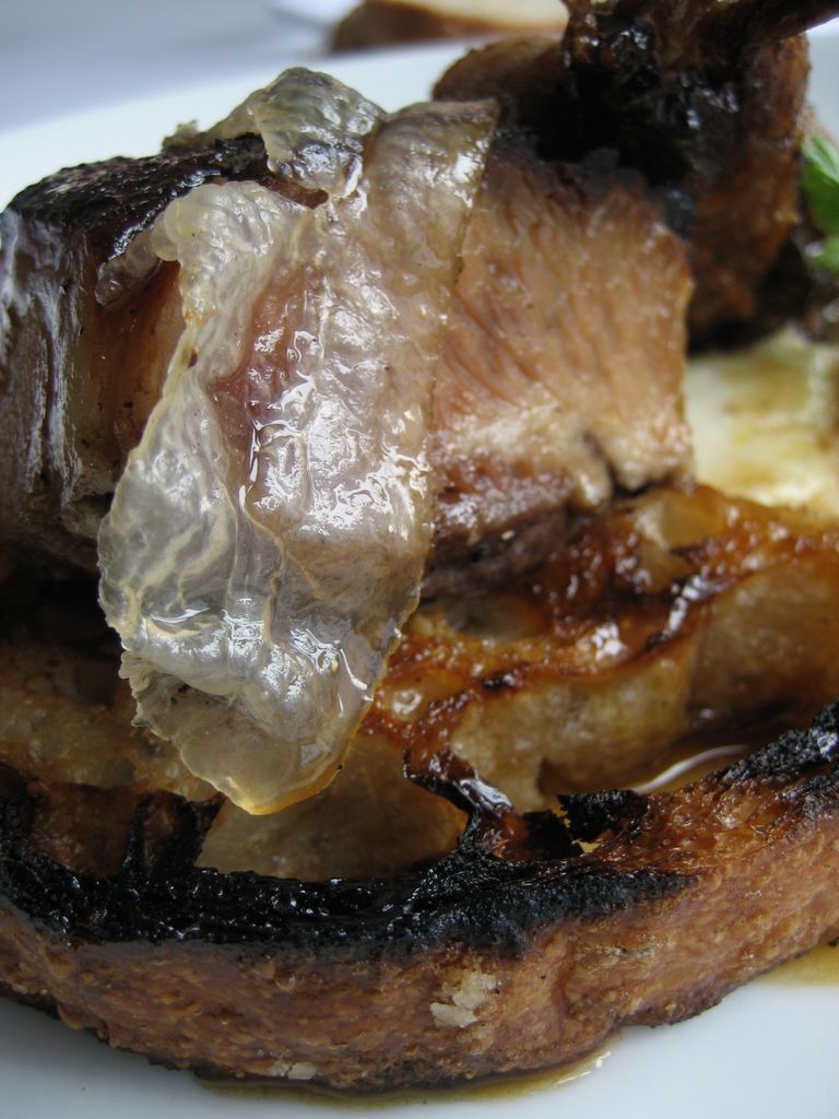 下面那塊是Kurobuta Pork Belly。Kurobuta是日文裡的「黑豚」,所以也就是黑豬的腹部五花肉那一塊。上面白白半透明的那一片是"Bellota" Lardo,是用肥豬肉去醃製出來的。這一整盤味覺層次豐富,每一口都是一個新的驚喜,好吃得不得了!這個在視覺上也是一大享受。