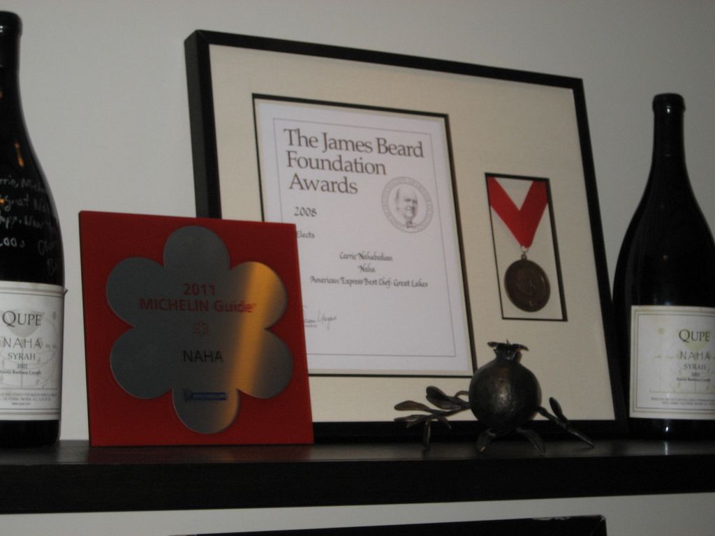 擺在帶位後方的兩塊獎牌。大的是2008年拿到的James Beard Awards。小的紅色的那一面是我來之前不知道它們已經摘下的米其林星星。