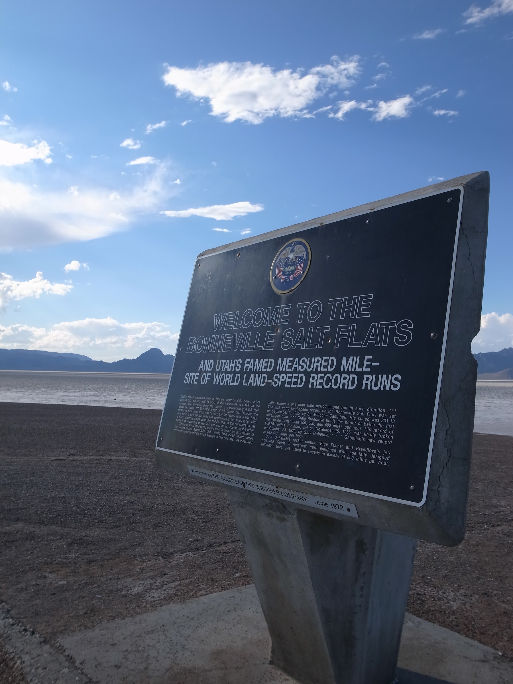 這段公路相當的長,Salt Lake和Salt Flats加在一起少說也超過七十哩,走完也要花一個小時左右。到了快到內華達州的時候有個休息區可以讓你下車看Salt Flats。雖然明知不是海,但是每次來這裡總會想到白居易長恨歌裡的那一句「忽聞海上有仙山」。