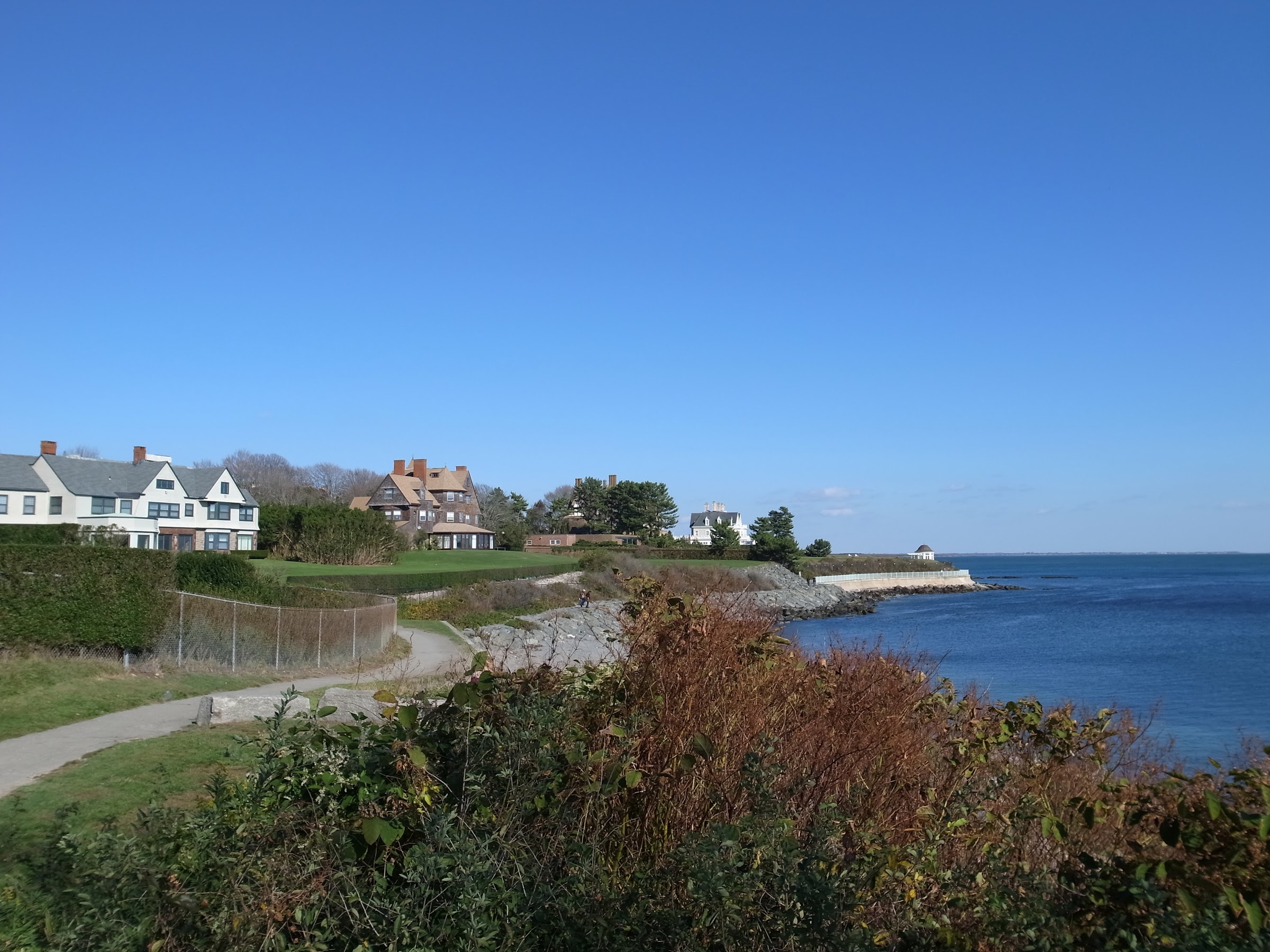 莊園當然也是有分黃金地段和非黃金地段的。大家都想擁有無敵海景,所以在海岸線上的最搶手。而這條Cliff Walk就是夾在這些靠海岸的莊園和懸崖邊的一條步道。它北起Memorial Blvd南迄Ocean Ave,全長近將近三哩半,一路的海景相當的漂亮。尤其到了到了南邊一段,步道在幾座出名的莊園之間穿梭,也是親近這些莊園的好方式。