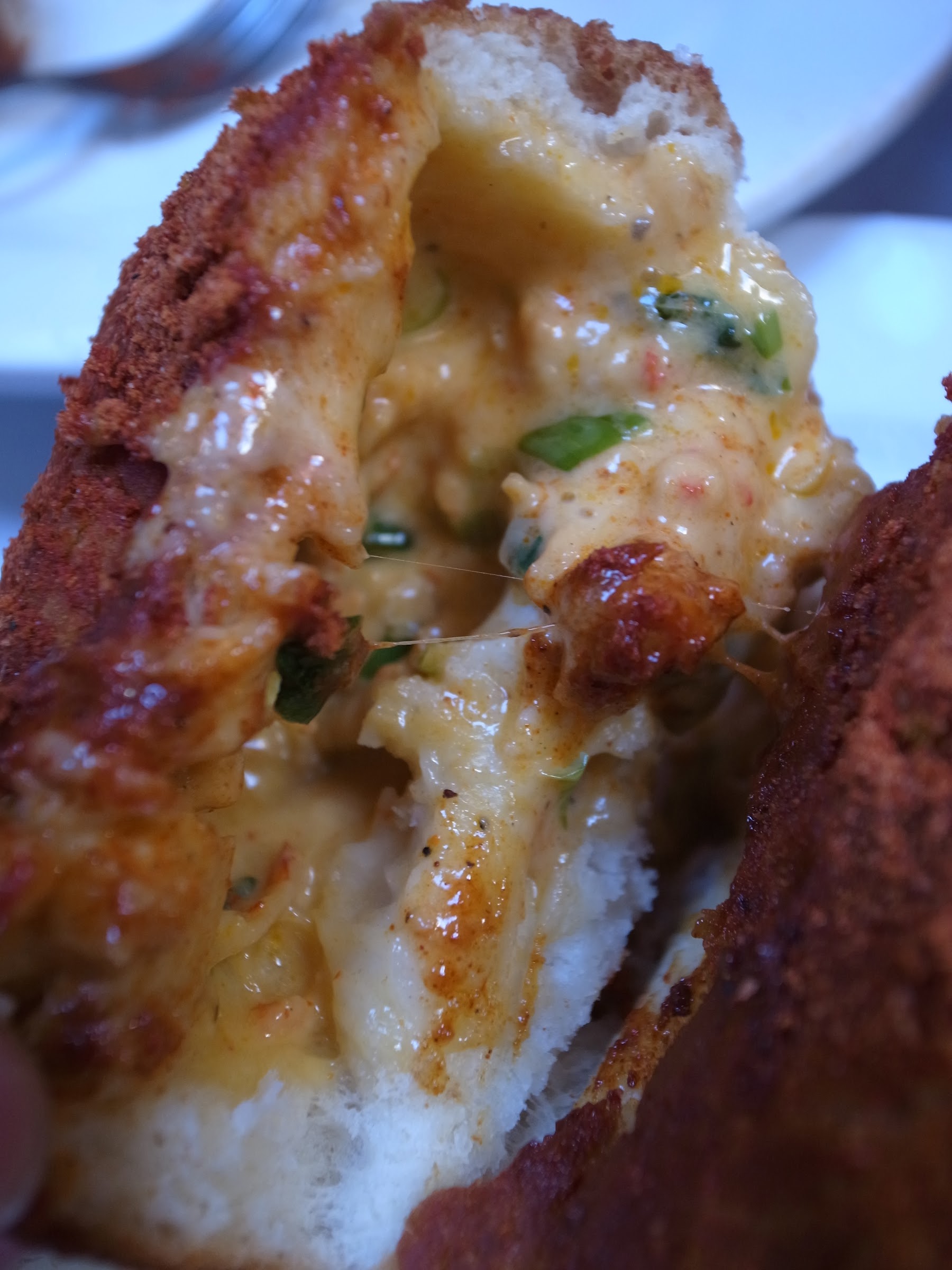 這個最厲害,是鹹的,裡頭是拿剛剛說是紐奧蘭的海鮮代表crawfish,cheddar起士,葱,和cayenne香料粉來作的。這四個beignet吃下來,其實覺得還是原味的最好吃。beignet吃的主要是拿個炸麵粉糊熱熱的時候灑上糖粉的那個香味。我是覺得裡頭如果加了這些「澎湃」的東西反而有但喧賓奪主。說實話,這家還是我第一次看到有人拿beignet來填其它東西的。
