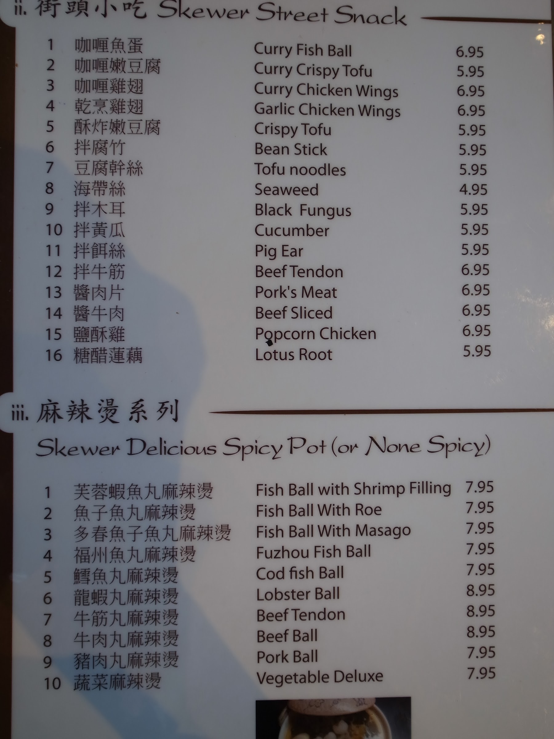 在美國的中國老移民通常地域性比較強烈一點。開的餐館賣廣東菜的就是廣東菜,賣北方菜的就是北方菜,井水不犯河水。不過新移民開的餐館賣的東西就變得比較雜。這個現象在新移民多的洛杉磯或是北加州的南灣就比較明顯。我對這種南北合什麼都賣的餐廳也没有什麼太大的意見,反正菜好吃就好,管它是那裡來的。只是非中國人吃中國菜純吃味道,我們吃味道也吃鄉愁。有的時候像這家一樣,香港的咖喱魚蛋,台灣的鹽酥雞,和福建的福州魚丸混在一起賣,那熬在一起的百味雜陳,倒是往往吃得有點茫然,不知道倒底在吃誰的鄉愁。