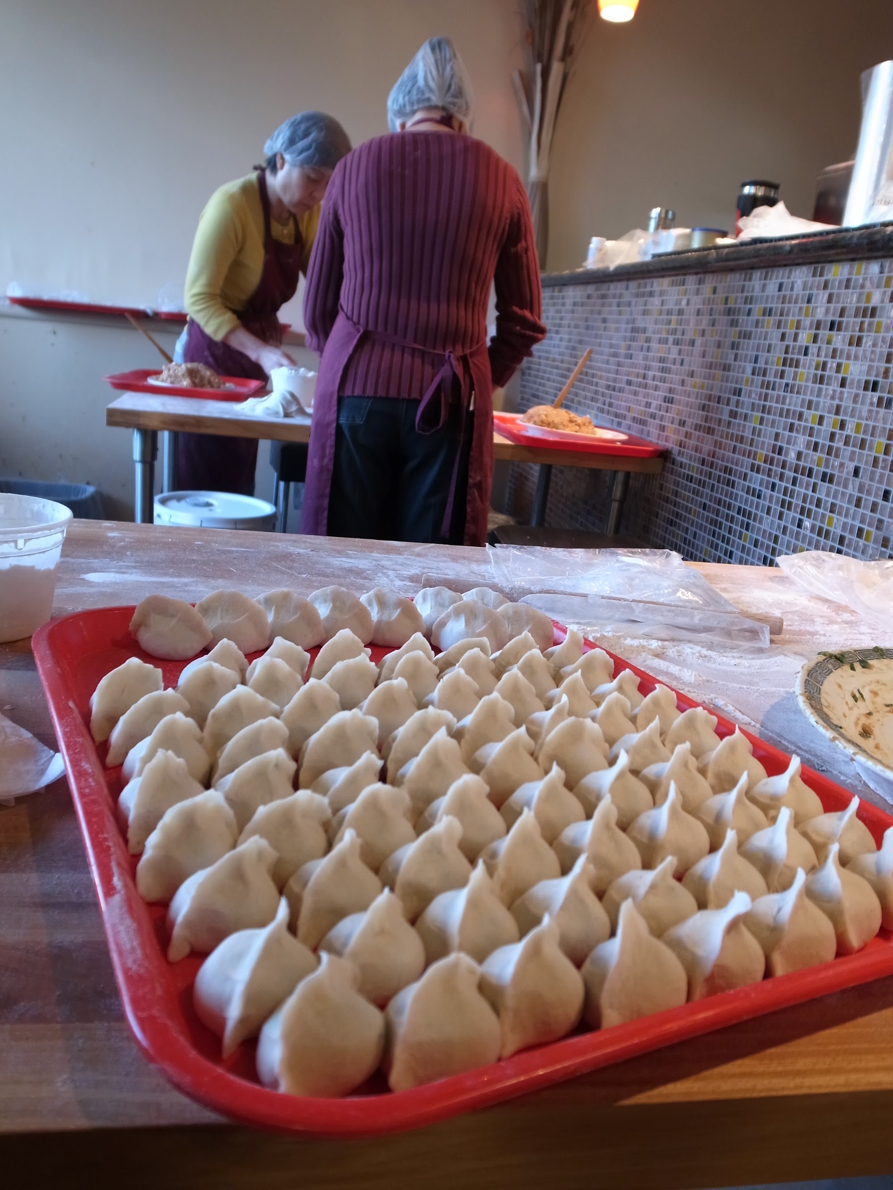 餐廳的左半邊搞得好像是一座食品加工廠。眾大嬸們在這裡包水餃。