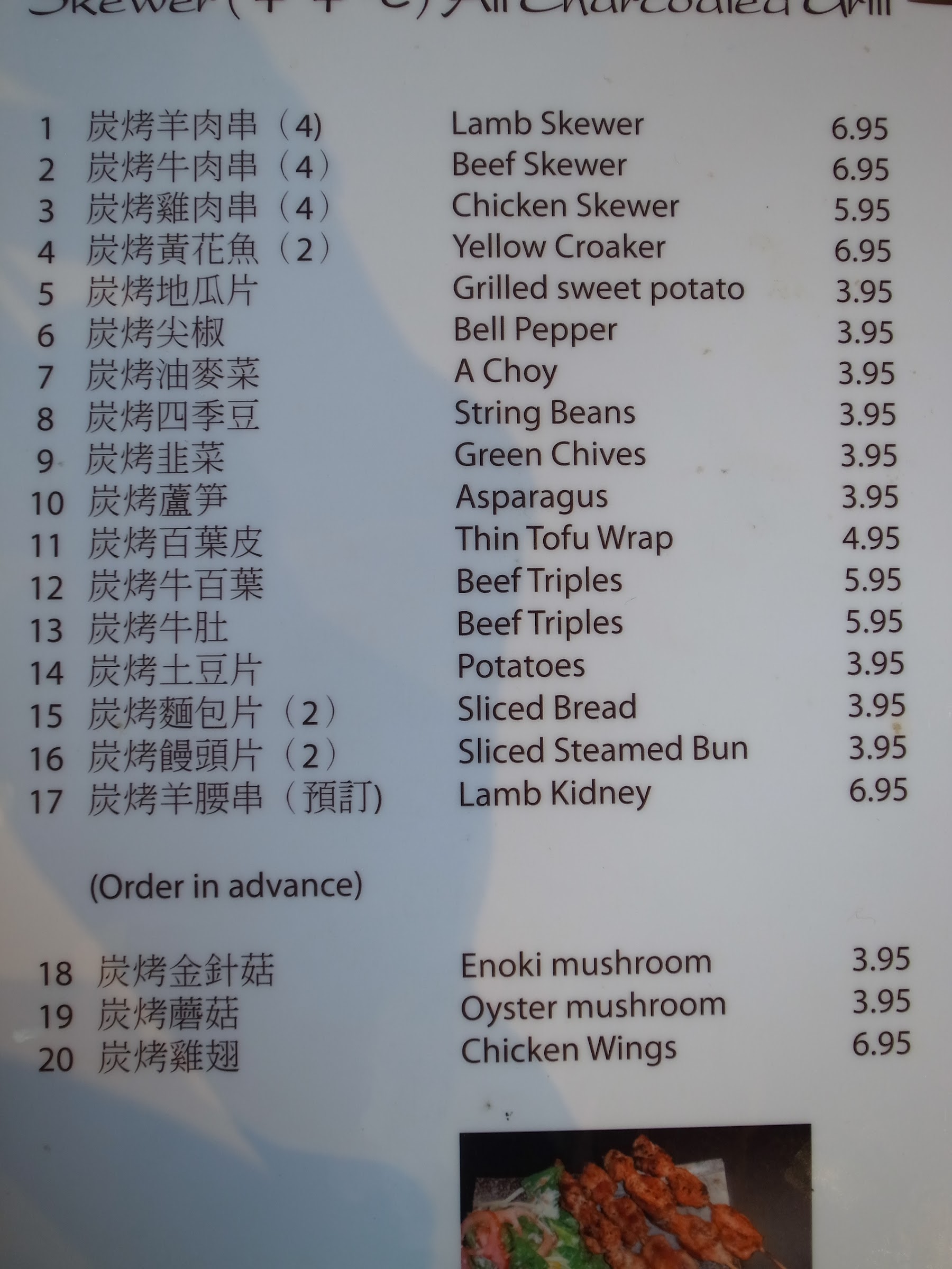炭烤羊肉串。朋友很愛這個,一口氣叫了兩盤。我是覺得還好,有點乾。