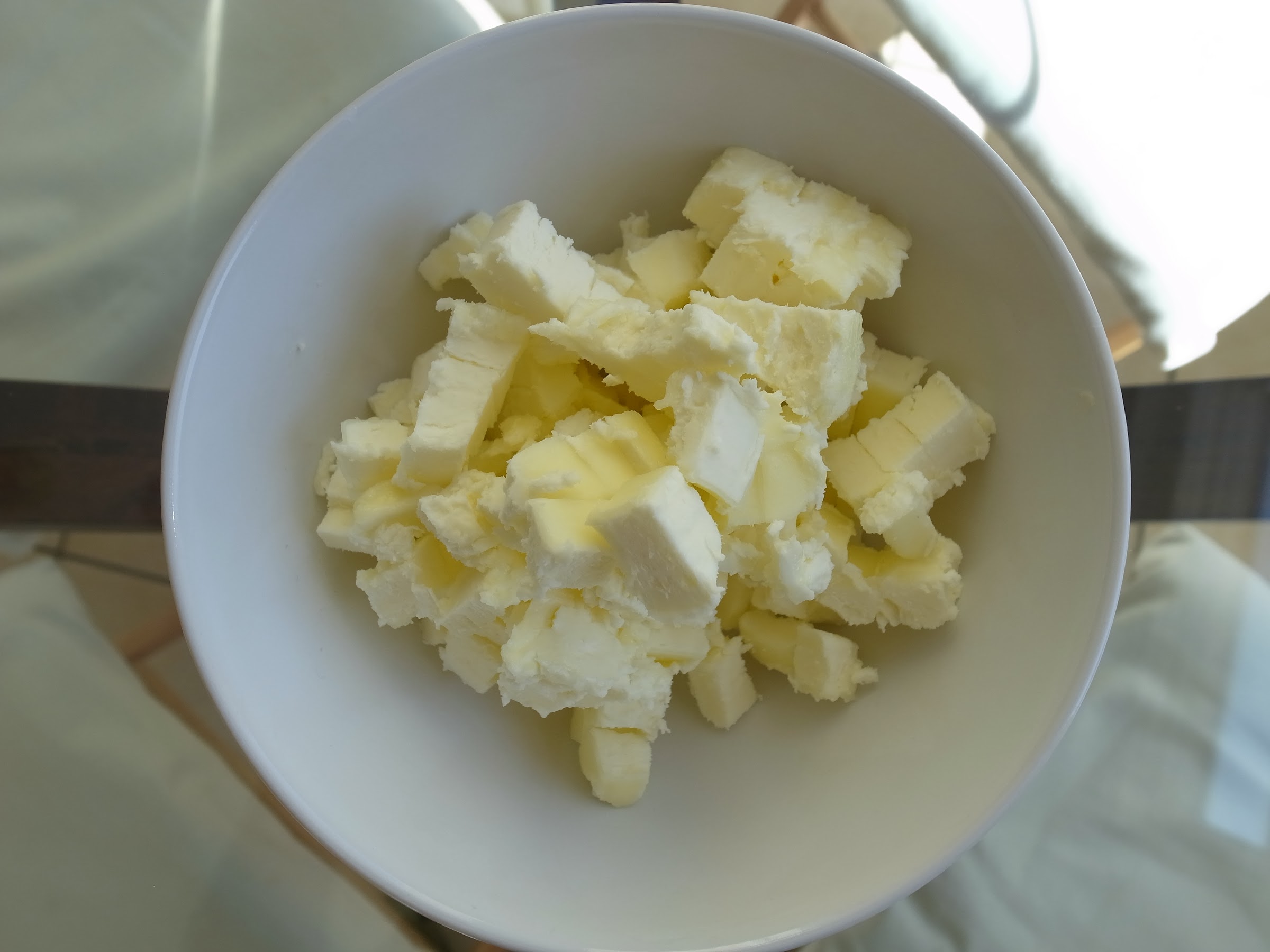 先來看派皮的部份:奶油1 cup+5 Ts切丁。作美式派皮奶油越冰越好,切完了以後可以再把它放到冷凍庫裡去冰個10-20分鐘。