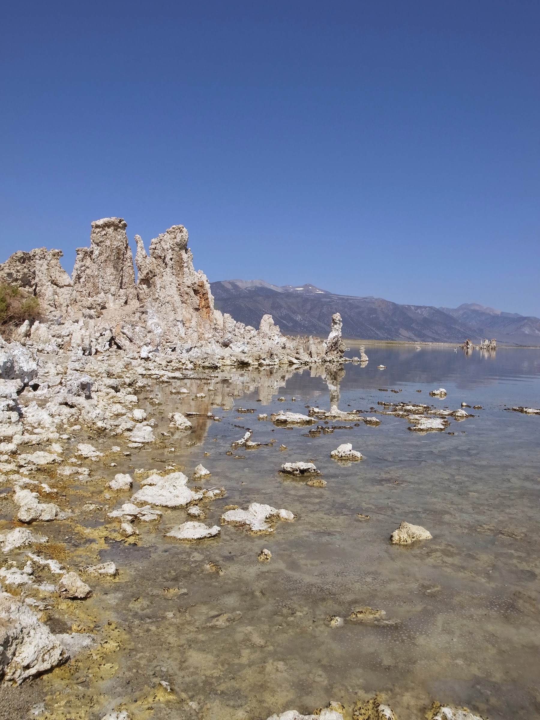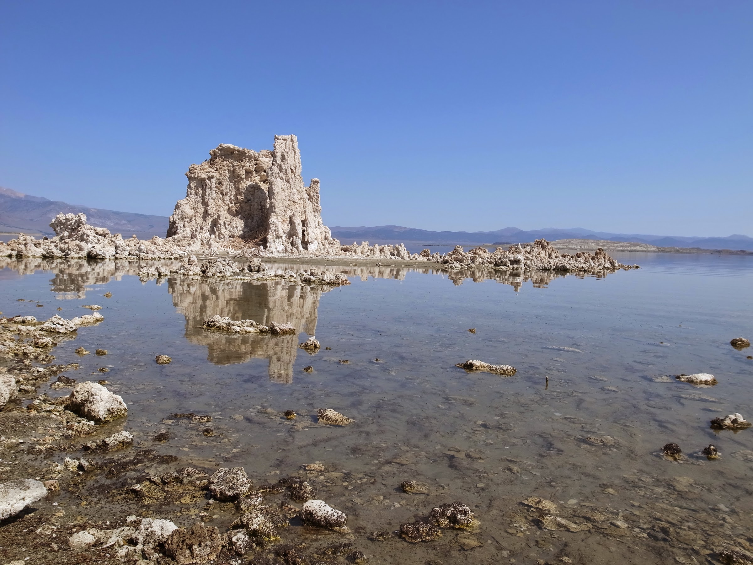 這個湖泊出名的地方在於它奇特的景色。當地下水裡的鈣質碰上了水裡的鹼性物質,長久以來形成了大大小小我們所謂的「tufa」石柱。這些「tufa」其實也就是我們中文裡常說的「石筍」。Mono Lake的這些「tufa」散布在湖中,和湖水相映,型成一幅奇幻瑰麗的美景。看來倒有些桂林山水裡那般石中有水,水中有石,奇石秀水錯落交織的景象。