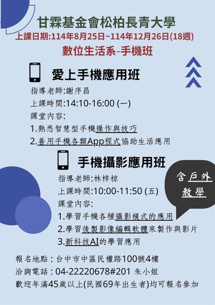 下學期【愛上手機應用班】從 8/25 起正式開課,整整18週,深入AI應用+實用APP技巧,陪您一步步掌握科技,走在時代尖端!
