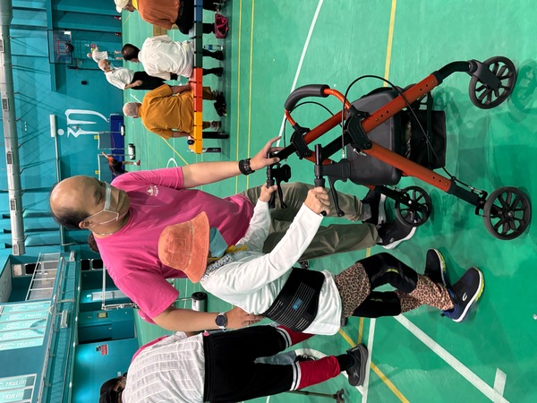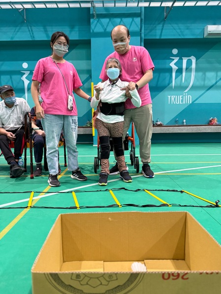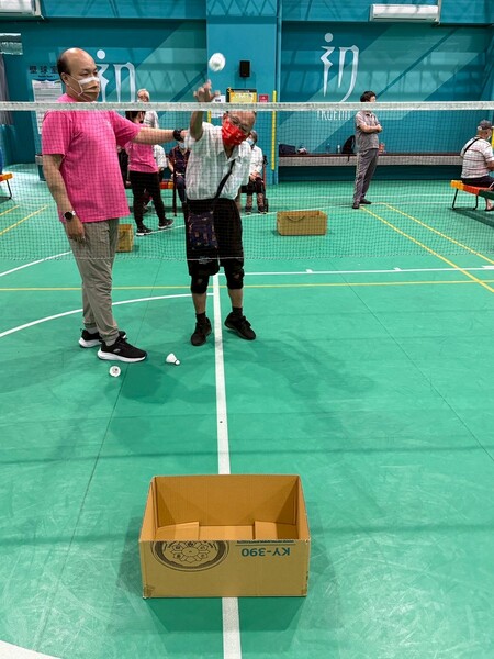 在課程中,功能較佳的長輩能夠兩兩配對,互打練習,重新喚醒身體的協調與反應;體能稍弱的長輩,則坐在椅子上練習拋接,同樣能感受到運動帶來的樂趣與成就。
