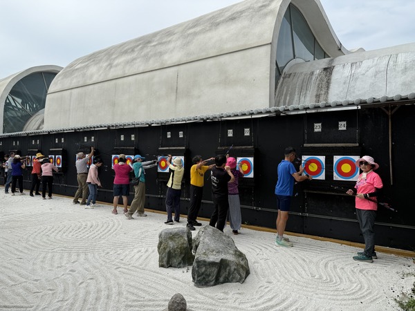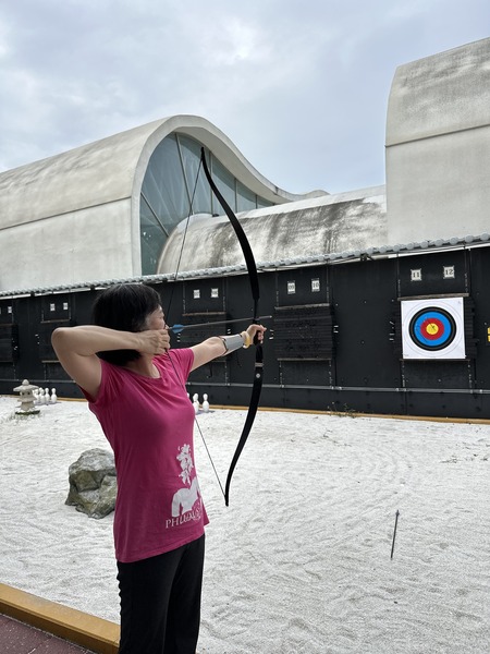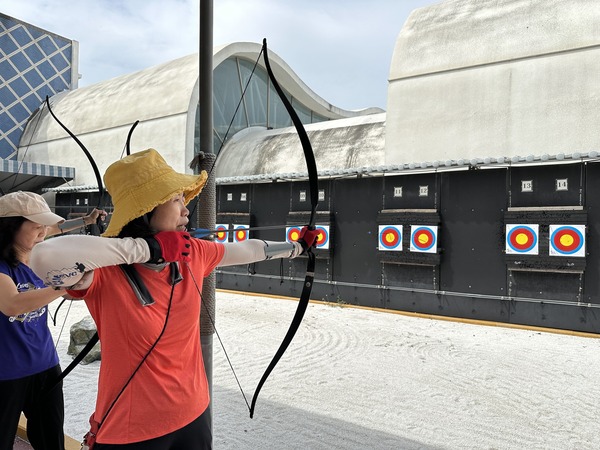 在教練的指導下,每位學員擺好姿勢、深呼吸、凝神專注,隨著「咻——!」的破風聲,箭矢直奔靶心。