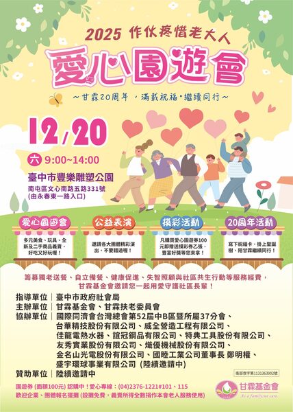 為了讓更多長輩在社區中獲得陪伴與支持,甘霖基金會將於歲末舉辦「疼惜老大人愛心園遊會」,邀請民眾、企業與社區夥伴共同參與。