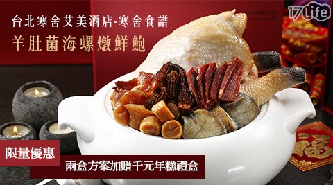 平均每盒最低只要3,380元起即可購得【台北寒舍艾美酒店《寒舍食譜》】羊肚菌海螺燉鮮鮑(不含湯盅)1盒/2盒,購買2盒方案加贈年糕禮盒1盒。