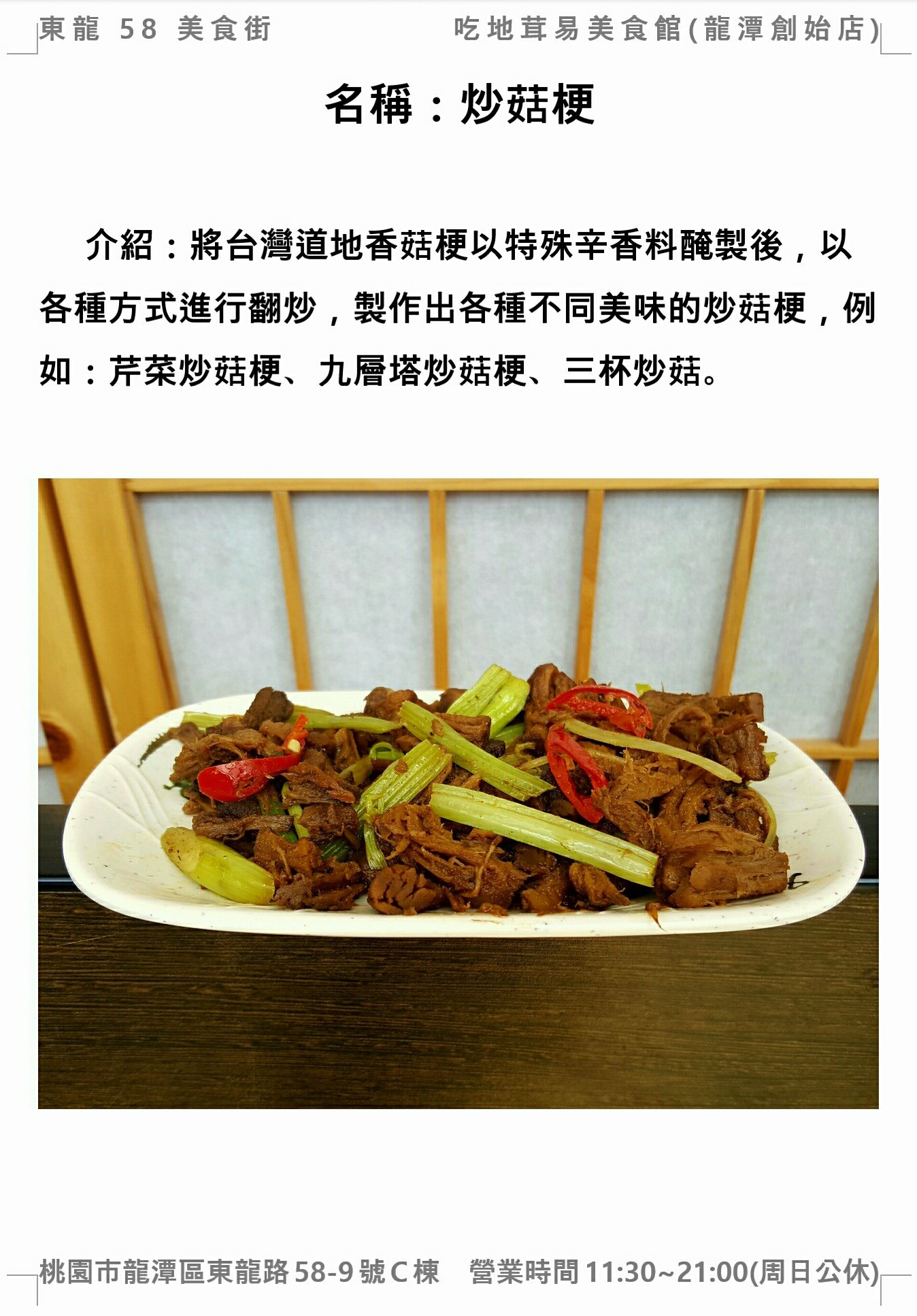 今天來向大家介紹一下位在桃園市龍潭區東龍路58-9號的{東龍58美食街},裡面其中一家{吃地茸易美食館}。