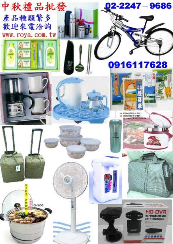 米禮盒 沐浴禮盒 腳踏車 環保筷 保溫杯禮盒 行李箱 電風扇 熱水瓶 燉鍋 行車記錄器 保鮮碗 泡茶壺 產品總纇繁多 歡迎電話洽詢 網址:www.roya.com.tw 連絡電話:0916-117-6...