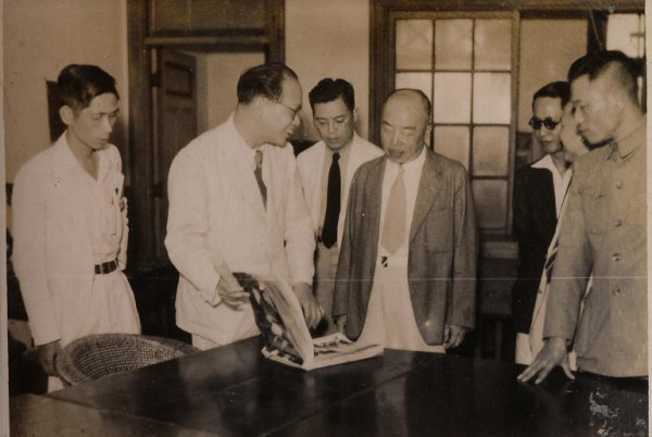 (陳儀視察新生報,後右黑領帶者是鄭士鎔,翻照的是李萬居。)鄭士鎔去世前,收到一筆「細說陳儀」的稿費,他兒子把稿費給他時,他說:「你來得正好,我剛才正在看著牆上老長官的照片,我對他說:『我一直沒忘記您對我的教誨。』」