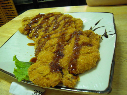 晚上七點多了,還要小排隊一下才有位子,炸豬排果然是超人氣商品,還沒點餐已經被它的份量震住,大小大概是一個女生雙手打開、比一個老鷹展翅手勢那麼大,三個人吃一份炸豬排都稍嫌脹,厚度大約有1.5公分,可不光是厚厚的麵皮大衣,是真材實料的大肉排,而且是完整的一片肉,更讓人驚訝的是一份才90元。