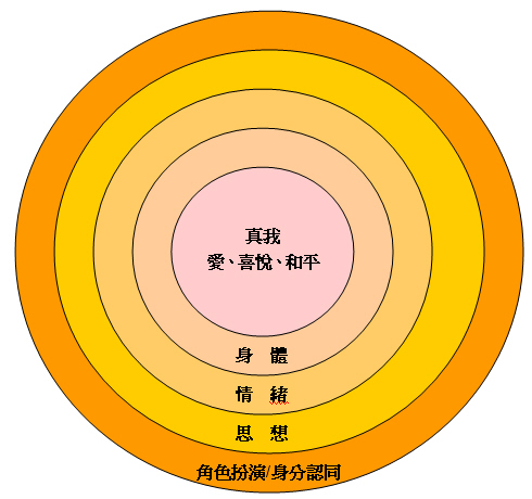 在『遇見未知的自己』這本書中,老人畫了一個"同心圓",在最裡層"真我"和最外層"小我"之間,隔著"身體"、"情緒"、"思想"和"角色扮演/身分認同"。