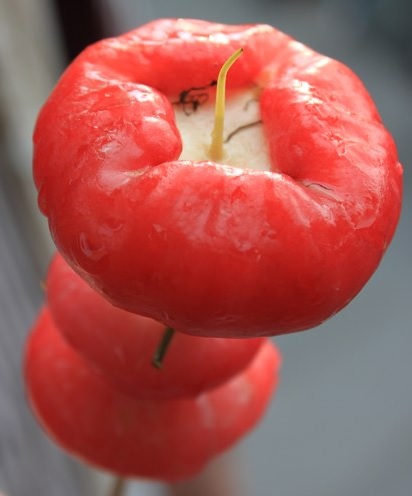 晚上十點半過後,陸續就會有挑擔的小販遠遠吆喝而來. 夏夜裡我最愛其中賣蓮霧的,那些蓮霧不到一個巴掌大,四到五個連串在竹枝上,冰鎮在一個超大的玻璃桶中,桶裡是大小不一的冰塊和加了鹽的冰水,被取出的蓮霧咬進口中時的沁涼與甘甜滋味真是美好. 也有賣杏仁露的,小販朝桶裡一舀就是一大塊杏仁,在碗裡添一瓢帶著碎冰塊的糖水,再加一些熟透的花生仁,味道芳香濃郁極了. 賣枝仔冰與芋仔冰的小販更是老少咸宜普受歡迎,那時的冰品都真材實料,無論酸梅或芋頭或百香果,全都果香滿溢,全然不似現代冰品滿嘴的化學再製香味. 這些小販多是本省人,但記得冬夜裡另有一種叫賣聲,隨叫賣聲之後就是一種很像拉響火車汽笛的嗚嗚聲,我始終沒聽不懂叫賣的名目,也似乎沒有鄰居去招呼過這個小販. 後來問了父親才知道那是販賣臭豆腐,可能是隨國民黨政府遷台的退伍老兵,一口濃厚的鄉音無人能懂. 孩童們聽說是種發臭味的豆腐,大家都掩鼻而逃,不明白怎會有人拿出來販賣? 到我年長後懂得臭豆腐的美妙滋味後,兒時冬夜聽過那闇啞蒼老的鄉音反倒一再在耳際迴響, 但我永遠無從比較今昔究竟哪種滋味更勝一籌了.....