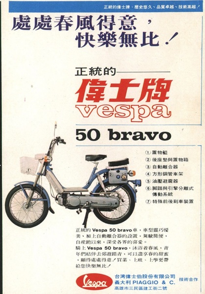 父親既決定買輛機車給我,也不拖延,隔沒幾天就帶我去選車.彼時民權路綠川西街口有一家專門經銷偉士牌(Vespa)機車的「中一車行」,老板唐先生是父親的舊識,父親就在那裡為我選購一輛藍色輕型機車.基本上,這輛機車長得與腳踏車沒啥兩樣,祇不過更像〝金剛型〞的腳踏車而已,雖然跟我原本盼望的有點出入,但好歹是機車,沒有理由挑剔.