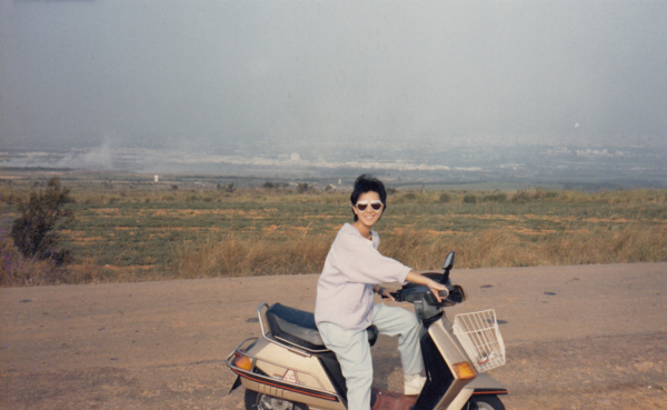 機會終於來臨.北上讀書的好友琮琪回台中渡暑假,我們倆幾乎天天見面到處兜風.那天想起來她還沒去過大肚山上呢,於是我說帶她去觀光一下台中市最高頂的風景,琮琪欣然答應.一路上我邊騎車邊做個負責的嚮導隨處指點各個地名和建築,到了[望高寮](其實當時都還沒出現這麼個名稱,大家都只以"大肚山上的望遠空地"而不名)後,琮琪見到那景色張口結舌的驚喜模樣,我也看的樂極了.雖是夏季,但山風強勁,瘦弱的琮琪待不久,我們於是離開.我按著從前父親騎過的行跡 - 就這麼一條小徑,不是往左就是往右,在沒有GPS的時代,尋路還真要憑直覺啊![望高寮]既然已是最高點,接下來當然就是下坡路段了.奇怪從前在父親帶領下並沒感覺下坡路段竟會那樣陡峭,這回是自己騎車才感受到.那樣險峭的下坡路段連頻頻握煞車柄都不怎麼管用,我可以清楚地感受到四個小小輪子十分辛苦滾動著.這時候已經不太顧得了要做盡職的嚮導了,我嘴裡一邊:[噫~噫~耶~~啊~~噢~~喔喔~~唷~~喂...]所有感歎詞輪番出口,一邊想會否就這樣一路滾下山...坐在後座的琮琪是我僅見的最佳乘客,一聲抱怨都沒有,只是緊閉著嘴.直到險降坡的路段漸趨平緩後,我才能定神回頭問她:[還好嗎?]她原本就白晢的臉龐更白了,苦笑著點頭.原來她先前的緘默不是因為對我的騎術有超強信心,而是嚇得說不出話祇得拼命禱告.坡度漸緩後,我們又開始瀏覽周遭環境,其實山路相當狹窄,堪堪僅供兩車錯身的距離,若是一個不小心就是墜落一旁的縱崖,那縱崖雖非深谷之危,僥倖不死也會重傷的.附近有一個平臺供玩家玩搖控飛機,我們見不到操作的人,但好幾架搖控飛機此起彼落互相較勁追築,煞是好看.觀賞一陣子又繼續騎下去,已經進了南屯區,因為見到往[嶺東商專]的路標,但我們還要經過[啟明學校],離中港路已經不遠.雖然那段險降坡相當考驗騎士的勇氣與技術和機車的性能,但騎過幾次後漸漸熟悉路段,便也不再那麼緊張了.那輛『光陽100』是陪伴我最久的機車,東征西討好幾年,可惜下場悲慘未能壽終正寢- 因為在1988年我赴美待產時,中正路一帶大火,停放在店裡的機車也跟著付之一炬成一堆廢鐵了.
