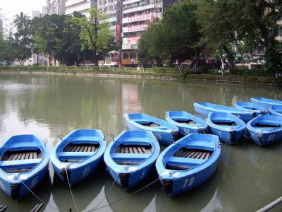 雖然對[中山公園]熟門熟路,可是從來沒在日月湖裡划過船,我們三個人湊足了船資就躍躍欲試想體會一下划船的經驗如何.雖然只是小學生,但我們三人都是高個子,岸邊租船的船老大有片刻的猶豫,畢竟抵擋不住白花花銀子的誘惑,板著臉跟我們吩咐說繞一圈日月湖就得上岸,我們欣然同意了.說好三個人輪流划槳,腳才踩進船底,我是倆人先划的其中之一,才剛拿起槳,心頭猛然吃了一驚:啊咧~好重的槳啊!先前我們在岸上觀察別人划船時都一臉輕鬆愜意,根本忘了所見都是大人划槳(而且是男生),哪裡知道手上這槳感覺好幾十斤重?!可是付了錢,小舟也被船老大輕輕一推就把我們推離岸邊,無論如何也得--唉,至少遊它一半日月湖吧.於是我們咬緊牙關又皉牙裂嘴(一邊咒罵船老大沒良心不事先預告),一邊仍要奮力擺弄那比我們體重還重上許多的船槳,竟也磕磕砰砰地過了水泥中正橋橋下的半圓洞,經過中正橋時我們抬頭望上看嚇了一跳,因為那半圓洞頂上盡是觸目驚心的蛛網連結.急急划過中正橋後,輪流搖槳的三人已經頭昏腦賬,索性停下來任小舟隨波逐流.沒想到這又是我們的誤判,因為我們以為成語中的"隨波"是很隨意流動的波,但當我們停槳歇手時才慢慢發現:水波其實仍會朝一個定向流轉,以致是經意而不是真正隨意.歇息喘沒好久,更吃驚地發現:船已經賊賊地自己漂流到噴水池附近了.這一驚非同小可,急急重新握槳,三個人又七嘴八舌互發指令彼此提醒,慌亂中,兩支槳大概也無所適從不知該聽從誰的;說時遲那時快,小船已經兀自撞上噴水池了.那從遠處看來賞心悅目的噴水池,如今正以傾盆大雨般的水勢毫不客氣地沖淋在我們三人和小船.不遠處岸邊的船老大表情歇斯底里,正以魔音傳腦對我們吼叫:[妳們這些死女囝仔,還不快點划開?要淹死啦~~]也不是我們故意充耳不聞,實在是兩支槳很想各自獨立所以不聽使喚,我們不停驚聲尖叫在視茫茫的災情中,總算划離開那個像瀑布般的噴水池.三人使盡最後吃奶的力氣滑回岸邊.不待靠岸,船老大早迫不及待踩進水裡伸手來拉船,餘怒未消碎碎唸個不停.