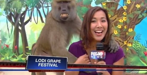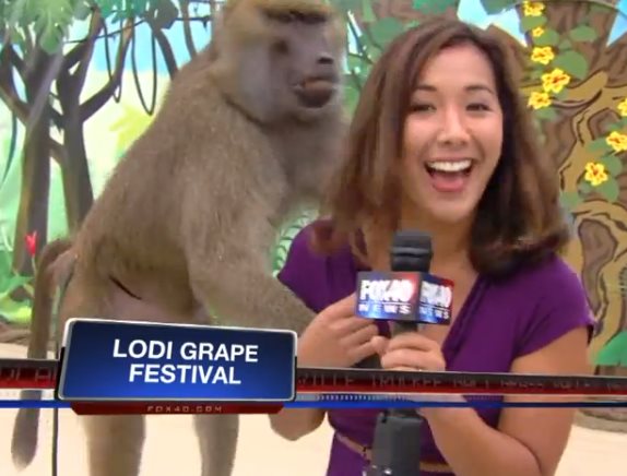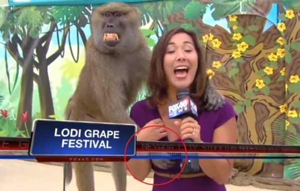 還記得因為遭到猴子扯掉洋裝,襲胸而爆紅的猴抓妹嗎?當時照片甚至紅到歐美,被網友瘋狂討論,如今美國Fox 40電視台女記者莎賓娜(Sabrina Rodriguez)在加州洛迪葡萄節做連線採訪時,也遭到狒狒伸出鹹豬手襲胸,嚇得她表情尷尬,而這隻襲胸狒狒露出的古怪表情,更讓網友哭笑不得。