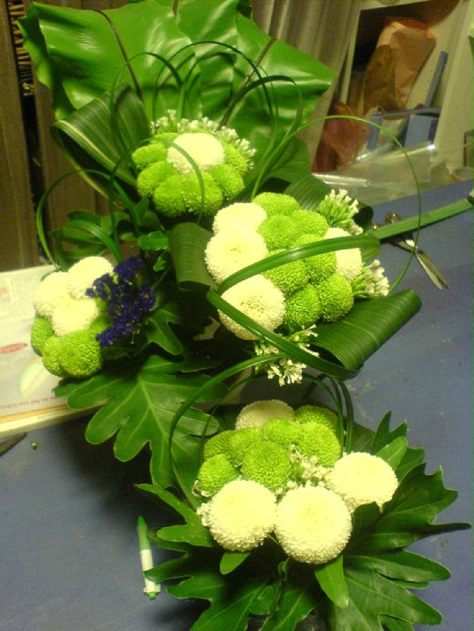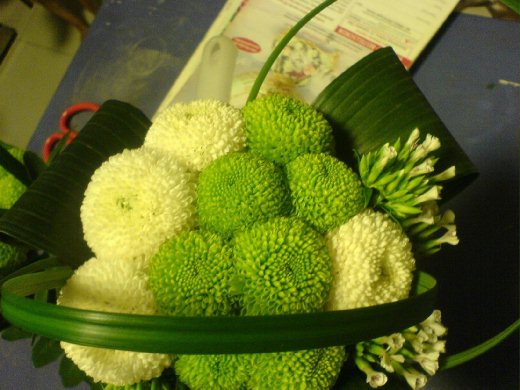 今次的材料主要是:綠色及白色的乒乓菊,其他則隨意添加。