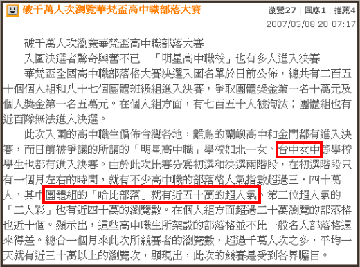 2007.03.05 部落格大賽初選揭曉,哈比部落前一個多月的努力果然沒有白費,當然也得感謝各位看官的青睞! 昨天華梵大學學務長,也就是這次比賽的主辦人之一──呂健吉教...