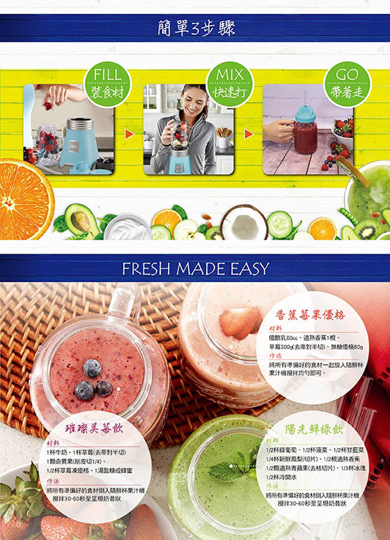 ●果汁機+隨行杯=2 in 1設計,符合時下快速輕飲概念!