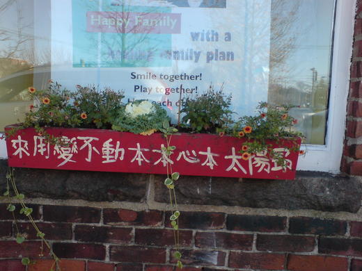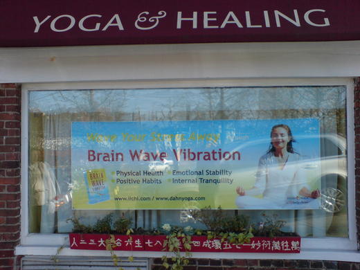 近幾年美國同胞意識到肥胖的嚴重性 這幾年各類型的媒體都鼓吹"動起來" 各類型的減肥中心健身房如雨後春筍四處林立 同時在東風西吹的影響下 瑜珈成了大熱門 我住的小城中心就有兩家瑜珈教室 瑜珈源出印度 但不知何時跟中國拉出了關係? 看看這瑜珈中心外頭的花架上的中文 這是啥跟啥啊?!
