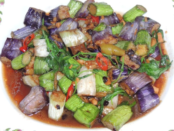 這是「塔香五行茄」,從田媽媽餐廳小農場現摘的黑茄、粉紅新娘茄、雙色茄、白茄、綠茄,市面罕見的各色茄子鮮嫩切段後,大火油悶紅燒,只加九層塔拌香,色香味都誘人。