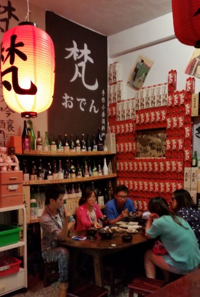 走進室內,映入眼簾的是大小不一的各式門簾,極富日本風,一支支清酒陳列架上;此外,老闆阿志將客人喝完的清酒空盒,都黏上牆面,形成壯觀的「清酒牆」。