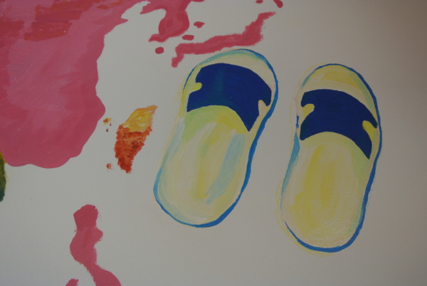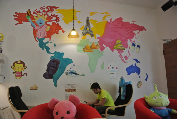 朝陽科大老師張有恆帶領學生在店內繪製世界地圖,創意十足的自由女神、金字塔,還有皮脫一半的番薯台灣和藍白拖鞋,是店內的吸睛牆。
