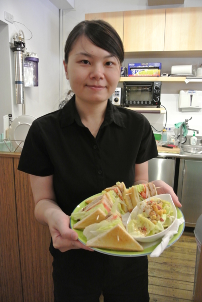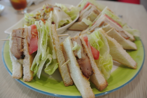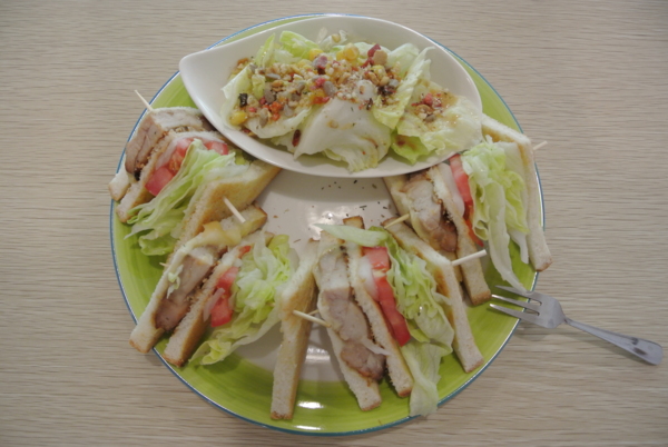 「照燒去骨雞腿排三明治」,起司香又黏牙,白吐司襯托雞腿肉香,隨餐沙拉加入堅果、葵花子,吃得到健康。