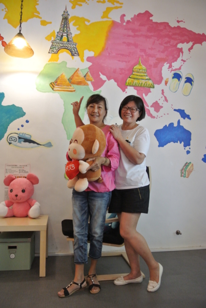 店內顧客抱著喜愛的玩偶,興奮要求與後方世界地圖合照。