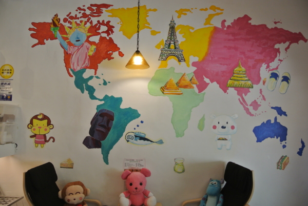 牆面手繪世界地圖,獨具特色的台灣,以番薯、藍白拖標記,是客人拍照打卡的熱門選項之一。