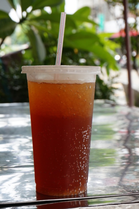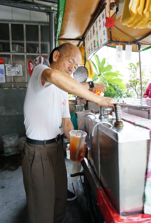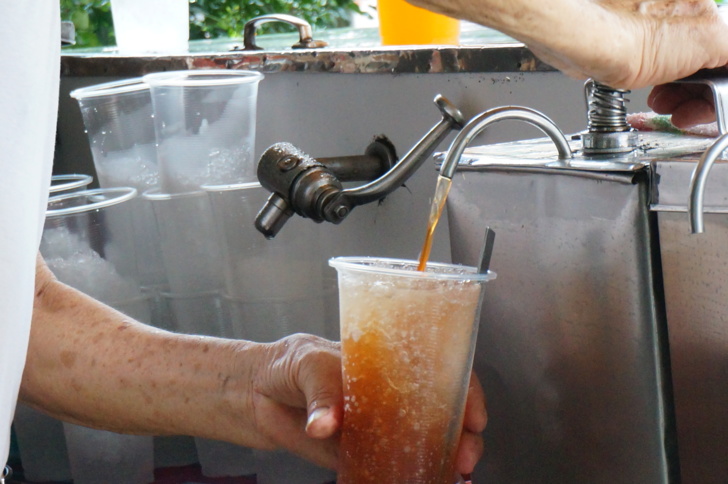 陳清郎每天清晨以手動方式將二氧化碳搖進水裡,變成大桶碳酸水,再到向榮街擺攤。顧客上門,他把碳酸水沖入已有一半碎冰的杯子中,快速攪拌,再添加醬料,堅持傳統作法。