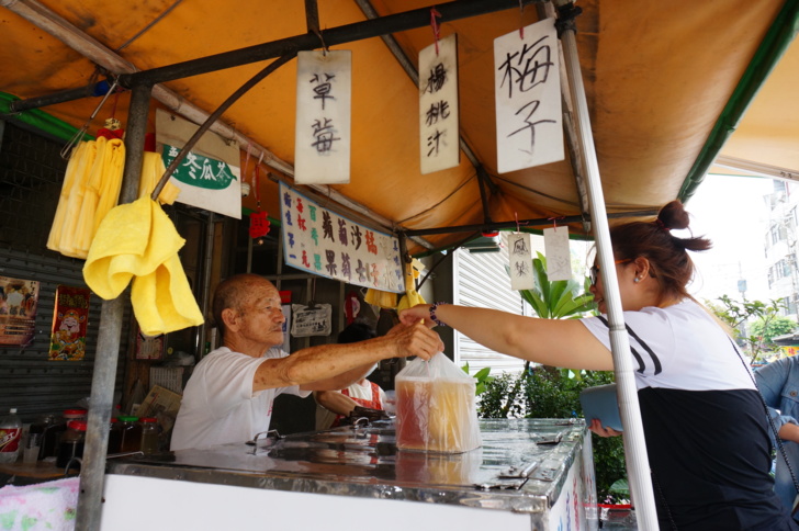 「我自己就很愛喝汽水!」陳清郎說,年輕時拜師學習製作汽水,從煤礦業轉行擺攤,一晃眼50年。最初用塑膠袋裝,一袋3元;雖然物價不停上漲,現在一杯700毫升也僅20元,堪稱便宜又大碗。