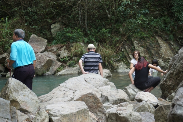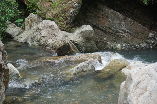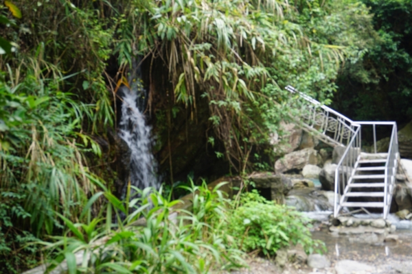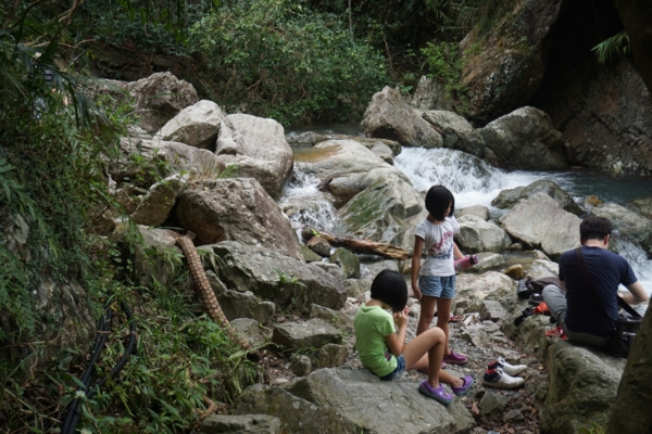 經過堤防,順著山林小徑走,遠處就可以聽到流水聲,不到100公尺就看到猴洞坑瀑布,站在岸邊就能感受到涼風,沿著瀑布旁樓梯攀爬,依序可以看到第一、二層瀑布,清澈的流水令人心曠神怡。