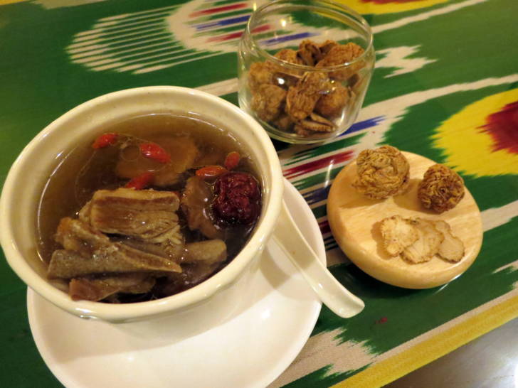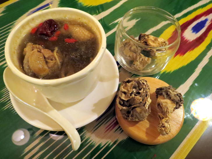 南晴強調所有菜色都能指定大、中、小辣,而且吃羊肉要像新疆人配茶喝,店內供應添加茯苓等中藥材的養生普洱茶。她還不惜成本,選用1公斤售價近萬元的珍貴瑪卡、巴楚野生蘑菇燉雞或羊排,製成特色湯品。