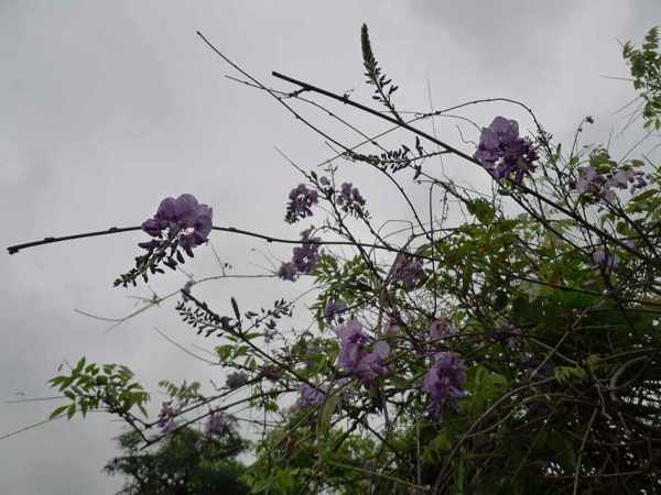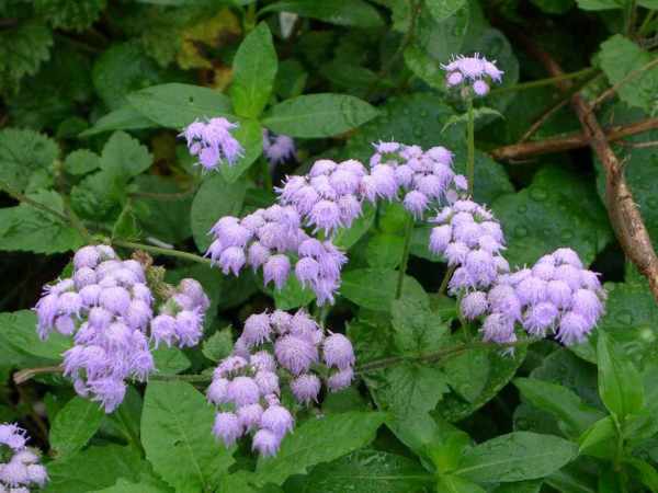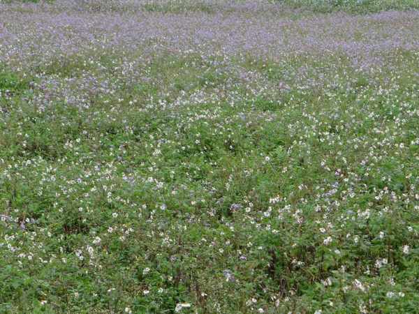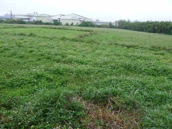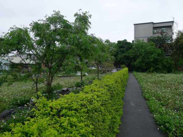 旁邊稻田鋪滿紫花藿香薊和大花咸豐草
