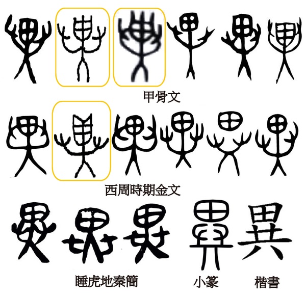 再來看看〈異〉字的甲骨文和金文,若〈異〉是一個人,