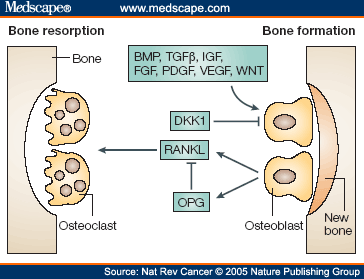 前半生有高密度骨質,後半生造骨細胞缺乏,只剩破骨細胞 osteoclast 持續分解骨細胞 osteocyte。