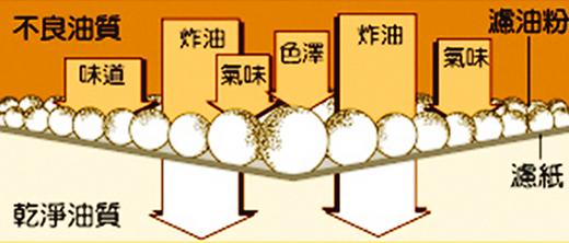 油炸食品是利用超過 160℃ 的熱油,讓食物表面脫水, 再由逐漸傳入的熱能煮熟內部,形成外脆內多汁的美食。不過,油炸過程會生成許多不健康物質,也讓許 多人對油炸食品避之唯恐不及。 致癌物質的生成 油的主要成份是三酸甘油酯,它是由三個脂肪酸分子與 一個甘油分子結合而成的化合物,甘油為三個碳的短鏈 分子,脂肪酸的碳數一般為 4~22,較常見的為 16 及 18。 輔仁大學食品科學系教授陳炳輝表示,油的加熱過程, 會與食物裡的水份、氧氣等產生水解、氧化、裂解、聚 合等複雜的化學變化,使熱油水解成甘油與游離脂肪酸,游離脂肪酸不斷加熱,還會再分解成更小的醛、 酸等物質;三酸甘油酯或游離脂肪酸也會形成過氧化物,若經裂解則會形成醛類、醇類、酸類、碳氫化合 物等。 此外,食物的油脂、色素等會進入油裡與油反應, 生成的自由基(含有未成對電子的化合物)彼此聚 合成更大的聚合物。 若吃入過多新產生的聚合物、裂解產物,有可能增 加罹癌機率,影響健康。 想吃得健康,就得控制油的使用時間 要避免吃進過多不良物質,選擇油炸油的種類以及 控制油炸油的使用時間就變得很重要。 油的主要成份雖然都是三酸甘油酯,但是當中的脂 肪酸還分飽和脂肪酸與不飽和脂肪酸,不飽和脂肪 酸含量越多,油越不安定。 飽和脂肪酸是碳鏈上沒有雙鍵;不飽和脂肪酸是碳 鏈上某些碳與碳之間有雙鍵,遇到自由基這類活性 分子,雙鍵中的共價鍵具有提供電子傾向,而產生 反應,兩個雙鍵中間的碳氫鍵的氫原子,於加熱過 程中較易脫落而生成自由基,自由基再與空氣中的 氧反應生成過氧化物,會進一步裂解而生成分子量 小的揮發性物質。 不飽和脂肪酸含量越高,油反覆使用次數就必須相 對減少。 一些餐廳業者為減低換油的頻率,會使用不飽和脂 肪酸約只有 50% 的棕櫚油;一般家庭油炸食物的量 不多且油炸時間短,即使用不飽和脂肪酸超過 85% 的大豆油,油的品質也不致太差,但要是長時間連 續油炸,大豆油的品質還是會變得很差。 什麼時候該換油? 當油炸過程產生的極性產物(分子因電荷分佈不均, 具正電端與負電端的物質)總量超過 25% 就得換新 油,若持續使用,很可能會影響健康。 要檢測極性化合物的總量,通常得在實驗室進行, 而且過程耗時。 現在檢測油品多半採用間接指標,即以「酸價」表示 油中包括游離脂肪酸在內的酸性物質含量,因為油炸 得越久,游離脂肪酸越多。 酸價的定義是 1 公克油脂中的酸性物質,所需氫氧化 鉀 KOH 才能中和酸鹼的毫克數,我國訂的油脂類酸 價標準值為 2.0 (mgKOH/g) 以下。 訂出酸價值後,就可以依據酸價檢測試紙的變色情 形,簡易判定油中的酸性物質是否超過標準。 以試紙測試的優點是檢測時間在一分鐘以內,但食 物若含有較多酸性物質,會影響準確度。 一般家庭沒有酸價檢測試紙,可以從油的顏色、味 道、濃稠度及發煙點(註)簡單判別。 油脂氧化程度越劇烈,越可能產生不良味道;聚合 物增加,油會變濃稠且顏色越深;而分子量小、 易揮發的游離脂肪酸增多,會使發煙點降低。 此外,油炸過程會產生氣泡,油表面的氣泡若超過 表面積的一半,就必須換油。 無論用什麼方法測試油的品質,油炸食品本身會吸 附許多油質,使熱量增高,因此,為了健康著想, 還是少吃油炸食品為妙。 註:油加熱過程產生油煙的溫度稱為發煙點。 游離脂肪酸含量越多,發煙點越低。 不同種類的油發煙點都不同,適合油炸的油, 發煙點以超過 200℃ 為佳,如大豆油、棕櫚油等。 而橄欖油、椰子油發煙點不到 200℃,不宜用來油炸。 濾油粉真的能改善油的品質? 為延長油炸油的壽命,不少餐廳業者會使用濾油粉 濾除油炸過程新產生的物質。 市面上有很多種濾油粉,較常使用的是合成矽酸鎂, 它能吸附油炸過程產生的極性物質,移除部份雜質。 濾油粉供應商匯格實業經理黃永基表示,正確使用 濾油粉的方法是要搭配濾油機,才能保證濾油粉不 會殘留在熱油中。 若只以細紗布、濾網等過濾濾油粉及食物殘渣,很 可能吃進殘留在熱油中的濾油粉。 濾油機包括金屬過濾槽、過濾隔板、馬達及抽油泵。 油在倒入過濾槽之前,濾紙要先鋪在過濾隔板之上, 再加濾油粉於濾紙上,通常 1 公斤的油約添加 9 公克 的濾油粉。 當油倒入過濾槽後,濾油粉就會將部份極性物質吸 走,其吸附效果會隨著油炸食物的種類而有差異。 極性物質被濾油粉吸走後,金屬過濾隔板下有一抽 油泵,可將油抽走,留下濾油粉及食物殘渣於濾紙 上。過濾後的油會較原先的油清澈,但不可能如新 油一樣。 因為濾油粉的作用只是減少極性物質,降低油品劣 變速度,熱油內還是殘留有極性物質和其他種類的 裂解產物或聚合物,並且持續進行氧化、裂解、 聚合等反應,因此油連續使用一段時間後,還是得 換新油。圖示濾油粉:炸油為何問題多多?