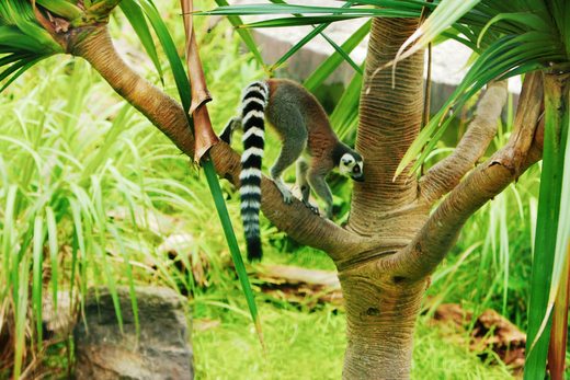 在世界第四大島──非洲的馬達加斯加島上,南部的稀樹森林中,較乾旱的疏林岩石地區,生活著一種世界上其他地方已經絕跡的動物——環尾狐猴 Lemur catta,Ring-tailed lemur,是唯一在白天活動的狐猴,作息安排很有秩序,每天要花3~4個小時進食,還要到固定水源去飲水。