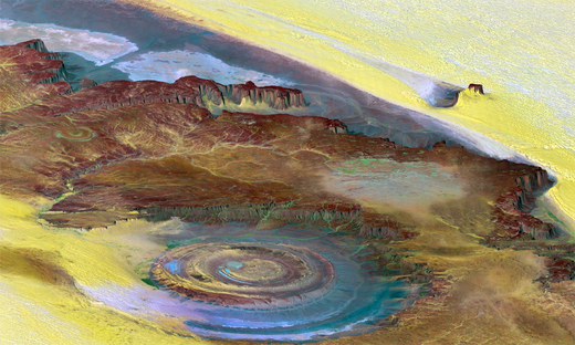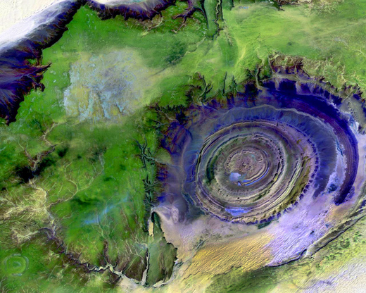 從太空中,人們將很容易發現位於非洲撒哈拉沙漠中茅利塔尼亞Mauritania 的 Richat 巨大同心圓地形結構體〈非洲之眼〉,直徑將近 50 公里,海拔高度約 400 公尺,中心地勢平坦,整體看起来就像個菊石。